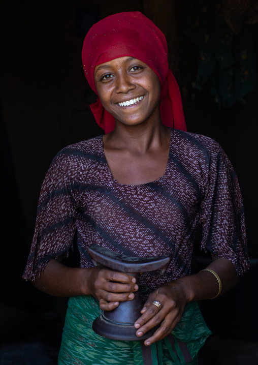 Portrait of a smiling raya tribe girl holding a wooden pillow, Afar Region, Chifra, Ethiopia