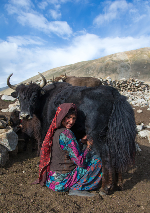 Wakhi nomad woman milking a yak, Big pamir, Wakhan, Afghanistan
