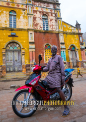 Benin, West Africa, Porto-Novo, old muslim man on a scooter in front of the multicoloured great mosque