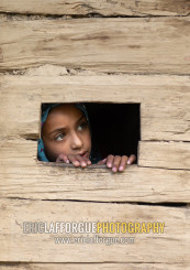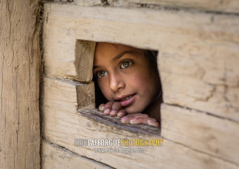 Gujjar Bakerwal girl looking through a hole in a house, Jammu and Kashmir, Kangan, India