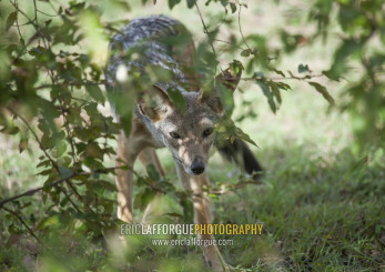 Young black-backed jackal (silver-backed jackal) hiding behind a tree, Rift valley province, Maasai mara, Kenya