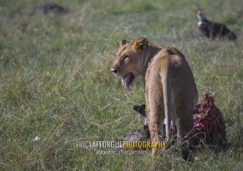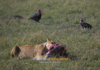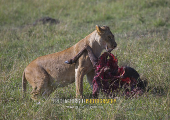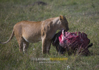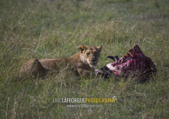 Lioness (panthera leo) eating a wildbeest, Rift valley province, Maasai mara, Kenya