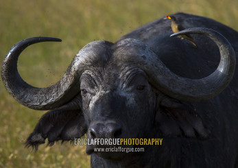 African buffalo (syncerus caffer) in grassland with oxpecker on back, Rift valley province, Maasai mara, Kenya