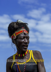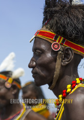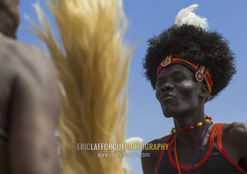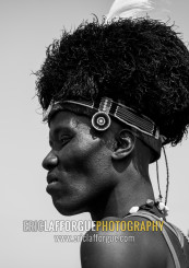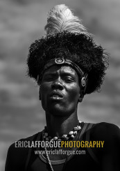 Turkana tribesman with headwear made of ostrich black feathers, Turkana lake, Loiyangalani, Kenya