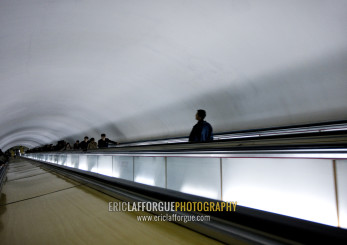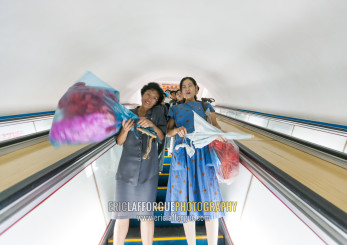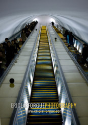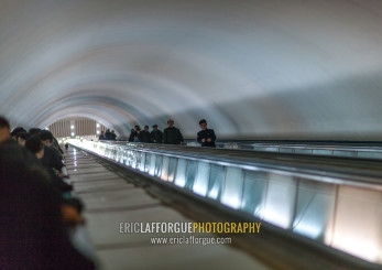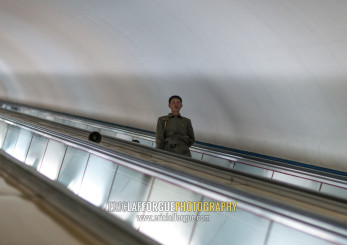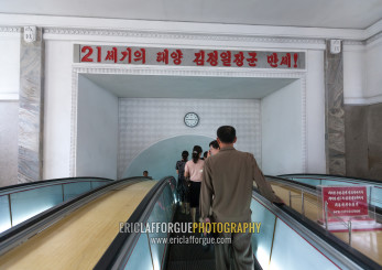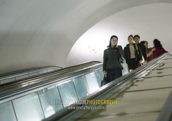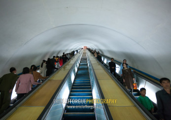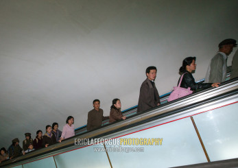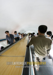 North Korean people using escalator leading to the subway station, Pyongan Province, Pyongyang, North Korea