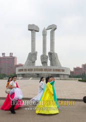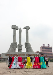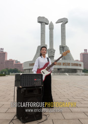 North Korean state artist performing on national day in front of the monument to Party founding, Pyongan Province, Pyongyang, North Korea
