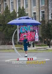 North Korean traffic security officer in blue uniform in front of a propaganda billboard, Pyongan Province, Pyongyang, North Korea