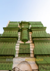 Old house with green wooden mashrabiya in al-Balad quarter, Mecca province, Jeddah, Saudi Arabia
