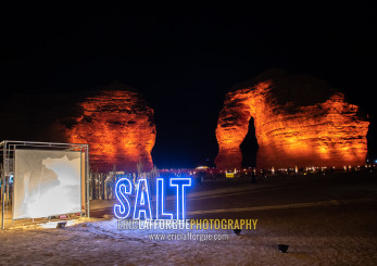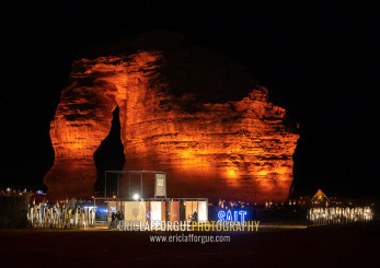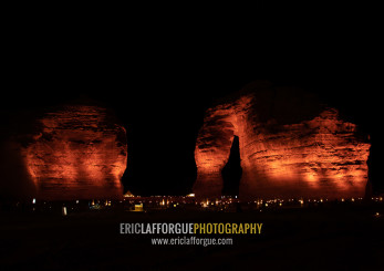 Elephant rock in Madain Saleh archaeologic site during winter at Tantora festival, Al Madinah Province, Alula, Saudi Arabia