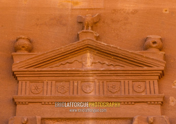 Top of the entrance of a tomb in al-Hijr archaeological site in Madain Saleh, Al Madinah Province, Alula, Saudi Arabia