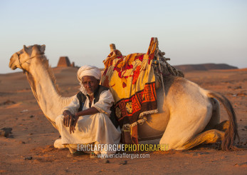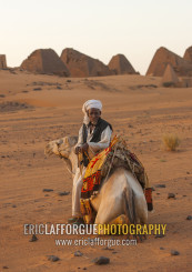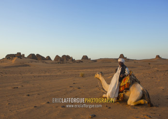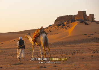 Sudan, Kush, Meroe, man and his camel in front of the pyramids and tombs in royal cemetery