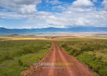 Tanzania, Arusha Region, Ngorongoro Conservation Area, a dirt track dissecting a vast short grass savannah plain surrounded by a volcano caldera wall