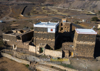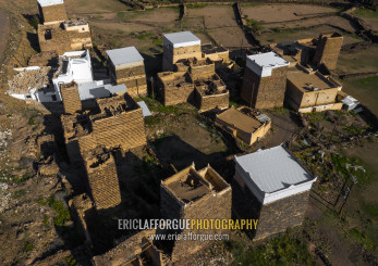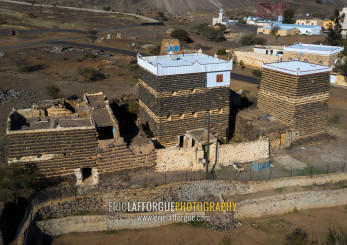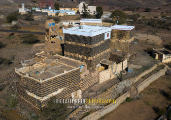 Aerial view of stone and mud houses with slates, Asir province, Sarat Abidah, Saudi Arabia
