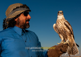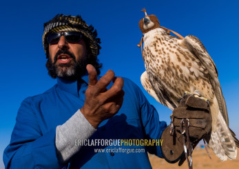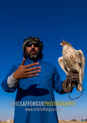 Saudi man with falcon perching on hand, Al-Jawf Province, Sakaka, Saudi Arabia