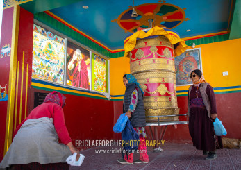 Prayer wheel with Dalai Lama portrait in Sonamling , Ladakh, Leh, India