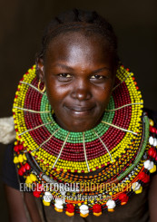 Turkana tribe woman with huge necklaces and ear rings, Turkana lake, Loiyangalani, Kenya