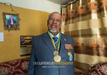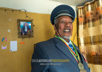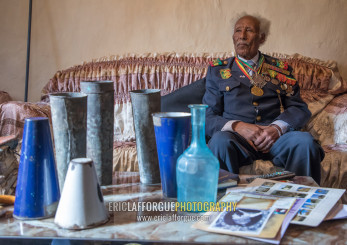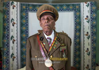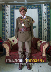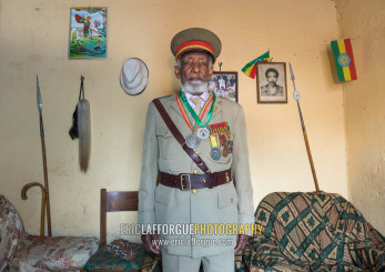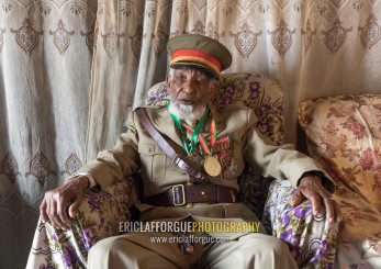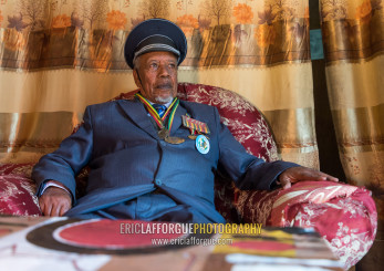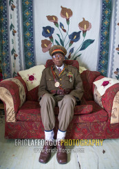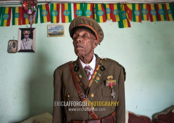 Ethiopian veteran from the italo-ethiopian war in army uniform in his home, Addis Ababa Region, Addis Ababa, Ethiopia