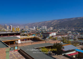 Rongwo monastery in front of the modern town, Tongren County, Longwu, China
