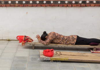 Tibetan pilgrim woman praying and prostrating in Hezuo monastery, Gansu province, Hezuo, China