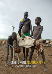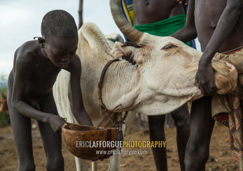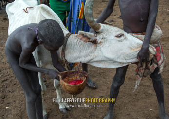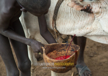Bodi tribe men collecting blood from a cow, Omo valley, Hana mursi, Ethiopia