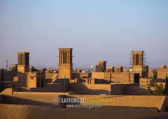 View of the city with traditional wind catchers and mosques at dusk, Yazd Province, Yazd, Iran