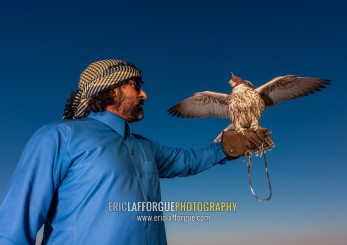 Saudi man with falcon perching on hand, Al-Jawf Province, Sakaka, Saudi Arabia