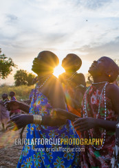 Toposa tribe women in traditional clothing looking at the sky, Namorunyang State, Kapoeta, South Sudan